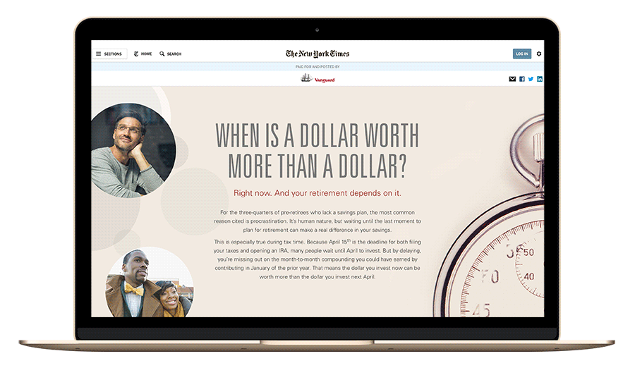 Vanguard wants everyone to start saving for retirement, right now, or suffer the procrastination penalty—losing out on compounded savings because you’ve waited too long to invest in an IRA. We partnered with the New York Times to create interactive branded content and data visualization that shows the procrastination penalty in action.